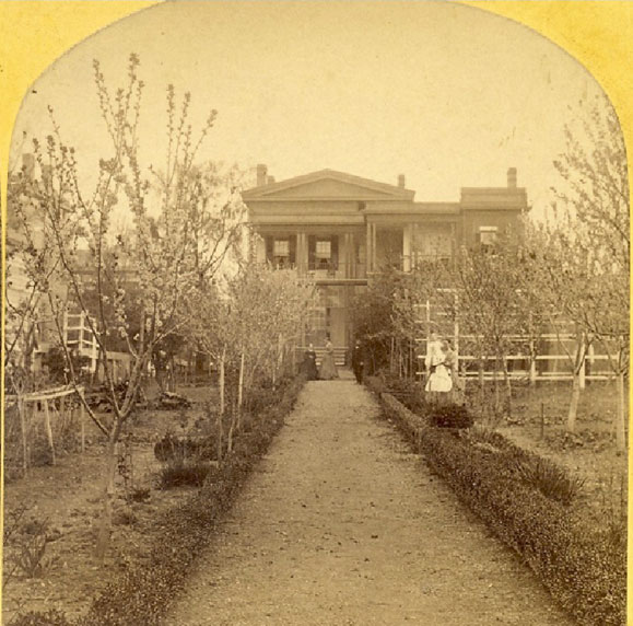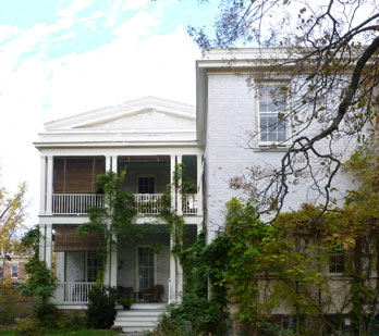 CIRCA 1840 CLASSIC HUDSON GREEK REVIVAL… Grand brick home with elegant spaces, high ceilings and original details, built about 1842 by Nathan Chamberlain, a prominent Hudson attorney. Shown at top in an early photo, and again today, the back of the house has two-story loggias overlooking the large garden. Located on Hudson's finest quiet residential block, walk to everything the thriving city has to offer. |