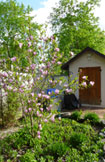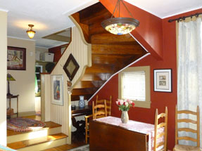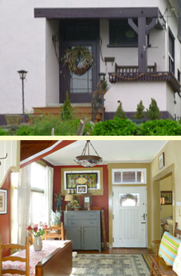 HUDSON TUDOR CHALET… 1912 eclectic home has front facing gable, steeply pitched roof, and decorative half timbering on stucco facade. High ceilings, wood floors, original windows and doors grace this charming three bedroom home. Built by Hudson architect as a birthday gift for his Austrian wife, there are many special details inside. First floor includes spacious living room, charming dining room, striking stair to second floor, kitchen, and powder room laundry combo. On the second floor are three bedrooms and bath, and an open landing. The finished third floor is great for studio, office, or gym. Set on a hill with mountain views, craftsman front porch, rear deck, patios, greenhouse, garden shed and lovely perennial gardens, with an extra lot for parking. Near the heart of Hudson, the new library is around the corner, Warren Street just a few blocks away; all Hudson's offerings an easy walk… $395,000 |