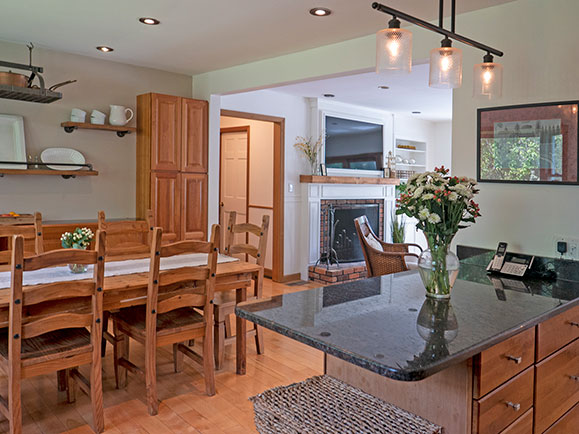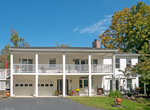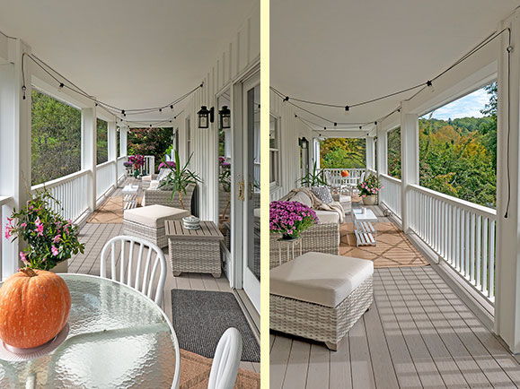 Hidden from the road, the home is at the end of a long driveway. Enter through a handsome front door with sidelights (or from the two-car garage) to a hall with stairs that lead up to the spacious main level with beautiful long porch.